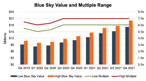 As seen on the chart above, Honda’s reported Blue Sky multiples have been unchanged since Q3 2020 at a range of 6x-7x. But from Q3 2020 to Q3 2021, earnings more than doubled, and 3-year average earnings increased 51% from $1.67 million to $2.52 million. Multiplying by the mid-point of the range, Blue Sky values increased from $10.9 million to $16.4 million. In Haig’s Q4 2021 report, ongoing earnings are now expected to be based on 2019, 2020, and 2021 earnings. With 2021 performance more than double 2018 earnings for import dealerships, this change in methodology further increases ongoing earnings. Based on our estimate of 2021 earnings, the average Honda dealership would fetch $18.6 million in Blue Sky or double its value from Q1 2020. While the mid-point multiple has only increased from 5.5x to 6.5x, ongoing earnings increased from $1.66 million to $2.86 million.