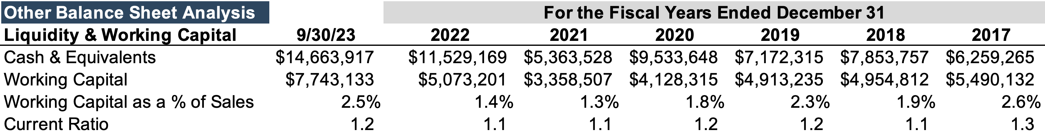 A quick review reveals that cash has increased by over $6 million since 2021 and $8 million since 2017 through the valuation date. Would the entirety of this increase represent excess working capital? Digging deeper, let’s examine the actual levels of working capital and working capital as a percentage of sales for the same company over the same historical period. As shown above, working capital increased as a percentage of sales. A rigid comparison of the latest period’s working capital to the prior period might indicate excess working capital either on the order of $2.7 million or 1% of sales. However, we note that it is not significantly above prior periods as sales have increased along with working capital balances.