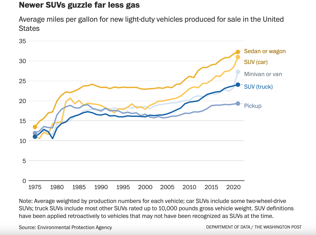 One advantage for sedans over their truck/SUV counterparts has always been fuel economy. While sedans continue to have an advantage over SUV (trucks) and pickups, newer SUV (cars)/crossovers are evening the playing field on fuel economy. As the chart below illustrates, SUV (cars) have made the greatest strides since 1975 and boast fuel economy above 30 miles per gallon, just like sedans or wagons.