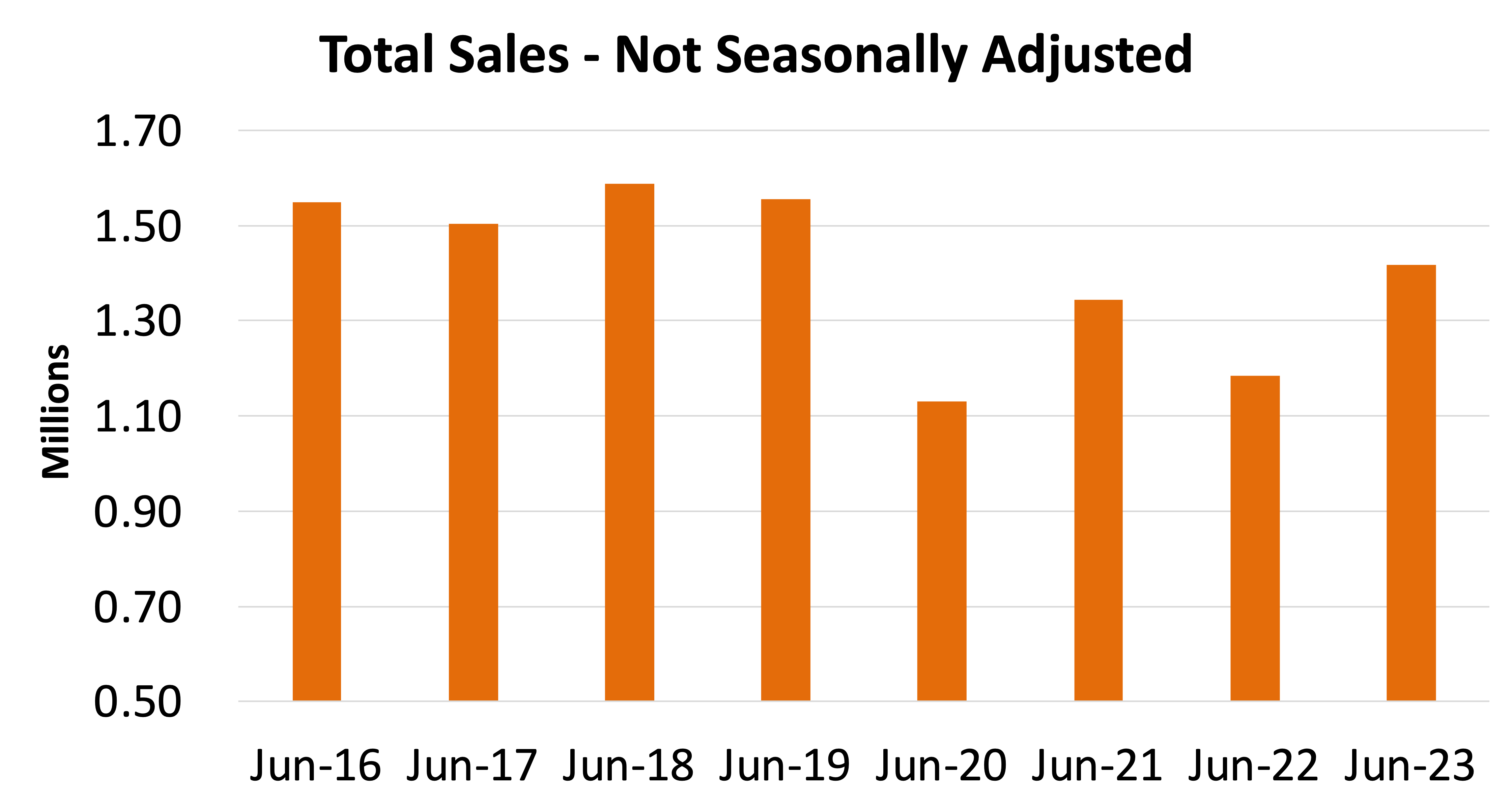 Compared to 2022, on an unadjusted basis, auto sales grew by 19.7% to 1.42 million units this past month. See the chart below for the last eight Junes’ unadjusted sales. When comparing the last four Junes (2020-23) to pre-pandemic sales trends, a return to about 1.5 million units during the high-selling summer months could be on the horizon. We will not be shocked if industry sales in the next two months reach 1.5 million units or more, although that is still a high bar to clear.