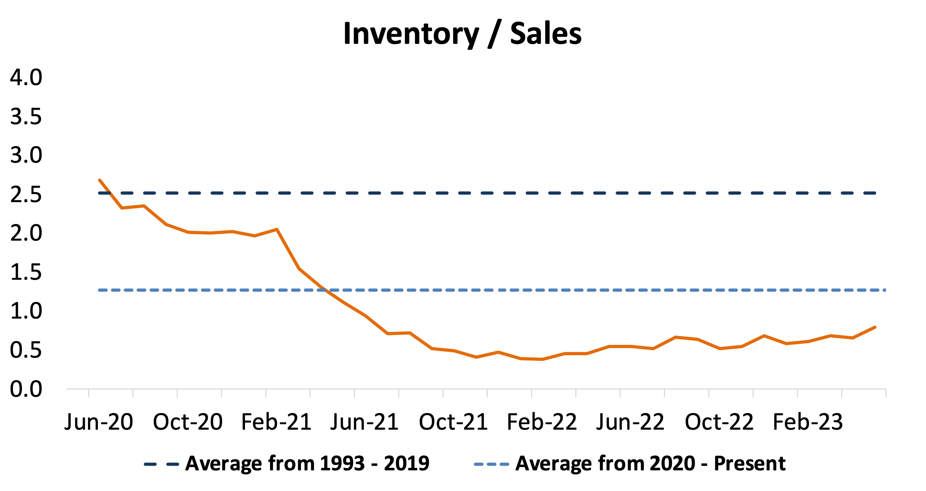 The industry’s inventory to sales ratio improved to 0.79x in May 2023. This ratio has been slowly approaching 1.0x since its all-time lows in late 2021 / early 2022, but pent-up demand has kept the ratio low amidst improving inventory conditions.