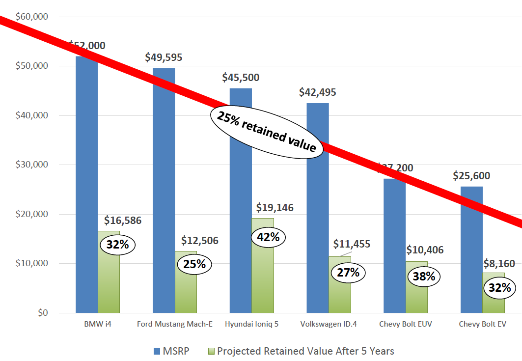 In addition to higher transaction prices, the six BEV models in the following graph are projected to lose 25%-42% of their value five years after purchase. This may seem like a high percentage, but for comparison, Capital Automotive noted that an iPhone 11 lost ~75% of its value five years after purchase.