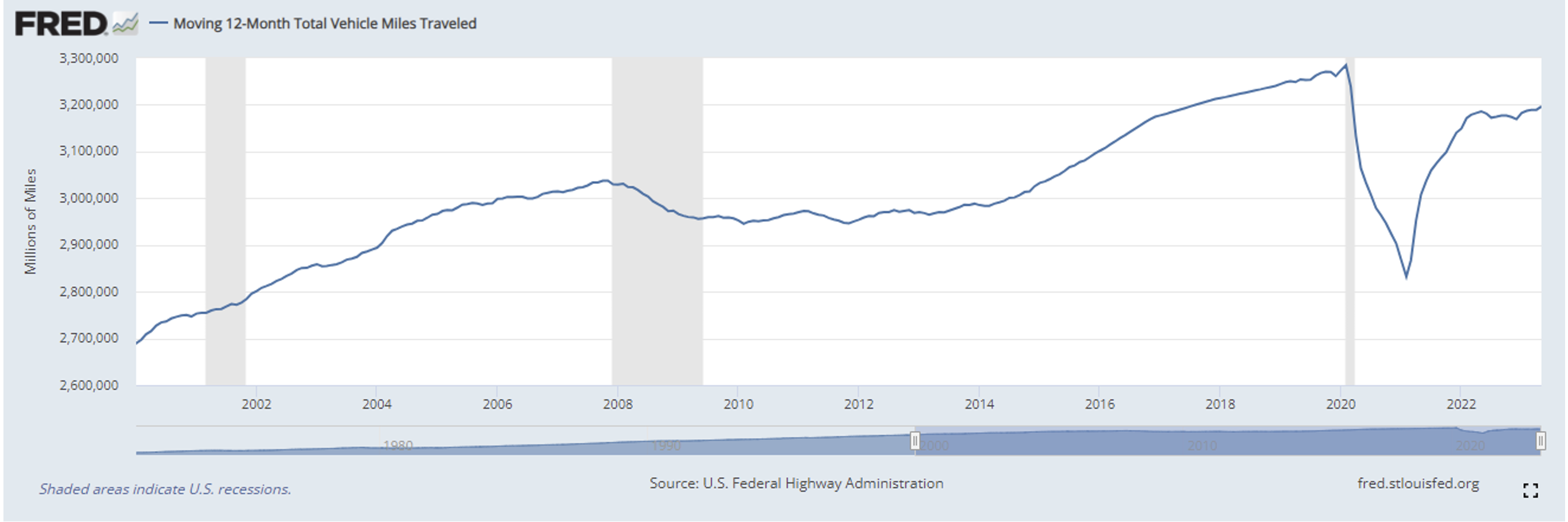 So how has the rolling-12-month average fared in the first half of 2023? Vehicle miles traveled have actually remained fairly flat since May 2022, with a slight decline in the winter months of 2022. Perhaps this indicates the impacts following the great resignation and the increased number of workers working remotely full-time or part-time. Those workers have many fewer commuting miles than before the pandemic.