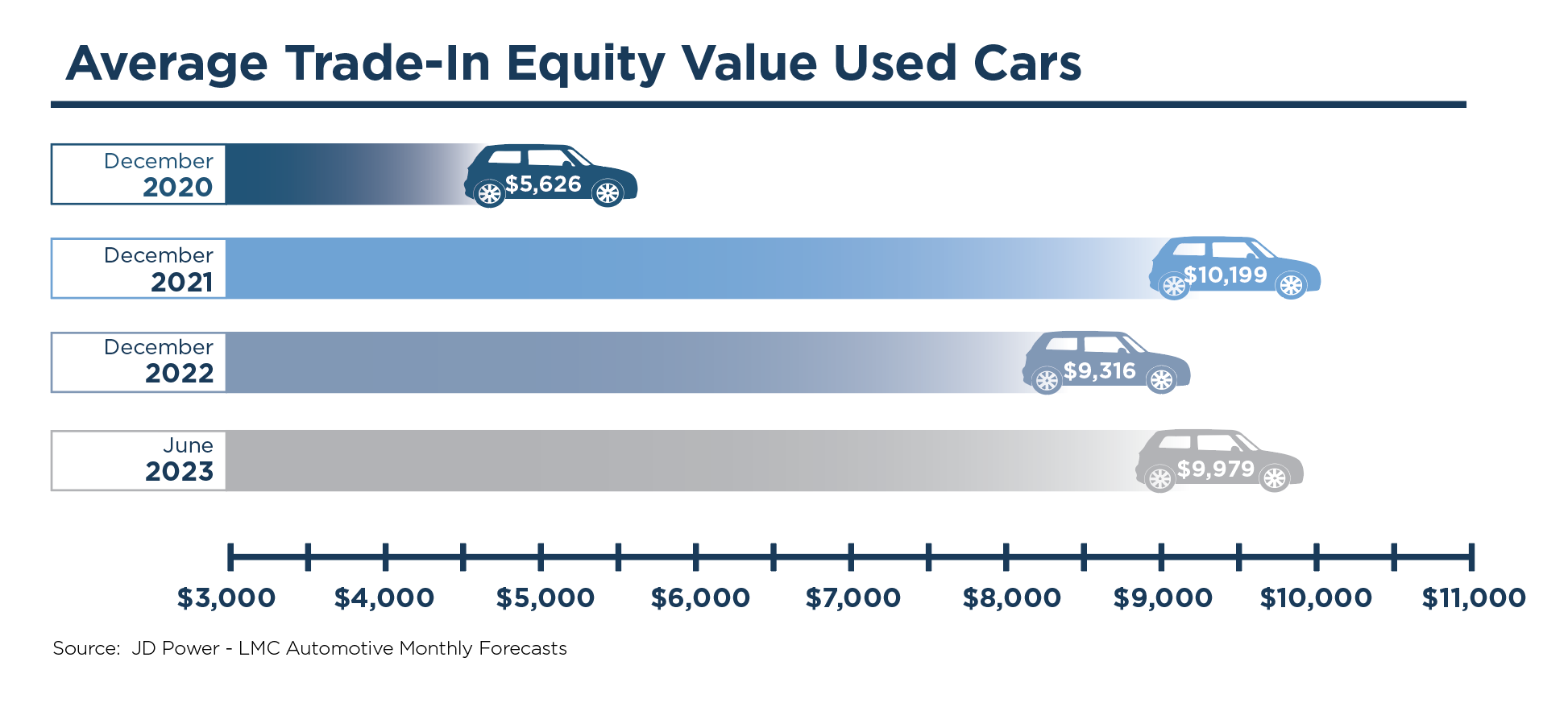 Like new vehicles, used vehicle transaction prices also soared during 2022 but have cooled some in recent months. Since fewer new vehicle units have been available to sell over the last few years, fewer used vehicles are traded into the dealer for resell. Increased demand for used vehicles led the average trade-in equity value for used cars to climb during the same period. Unlike other trends, the average trade-in equity value for used vehicles has climbed from year-end and early figures in 2023. According to the monthly forecasts from JD Power/LMC Automotive, the average trade-in equity value totaled $9,979 for June 2023 compared to $9,316 in December 2022.
