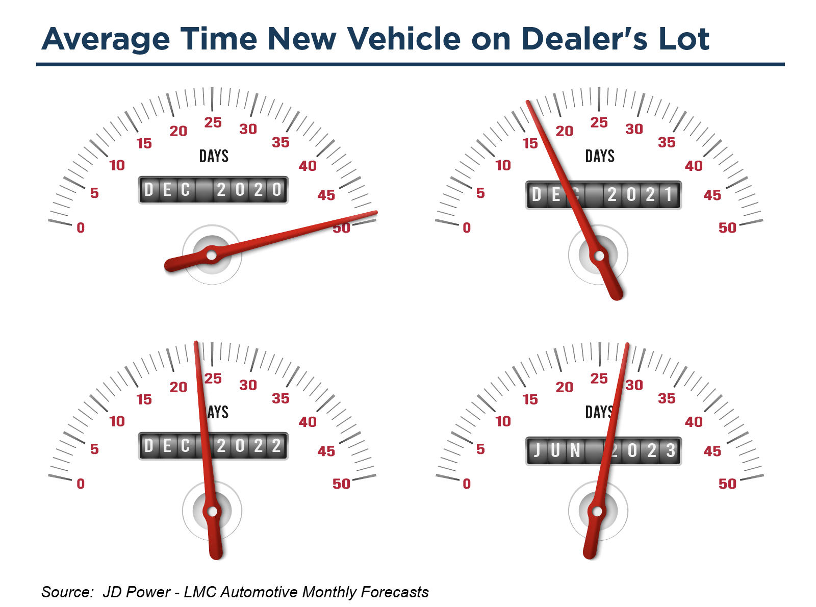Within these average day figures, dealers continue to pre-sell a large portion of their reduced vehicle allocations during this post-pandemic transition and recovery from the microchip shortage. JD Power indicates that 46% of new vehicles are actually selling within ten days of arriving on a dealer’s lot. For context, this percentage is down from 57% of new vehicles sold within the first ten days on the lot in March 2022 but level with the percentage that dealers were experiencing at year-end 2022.