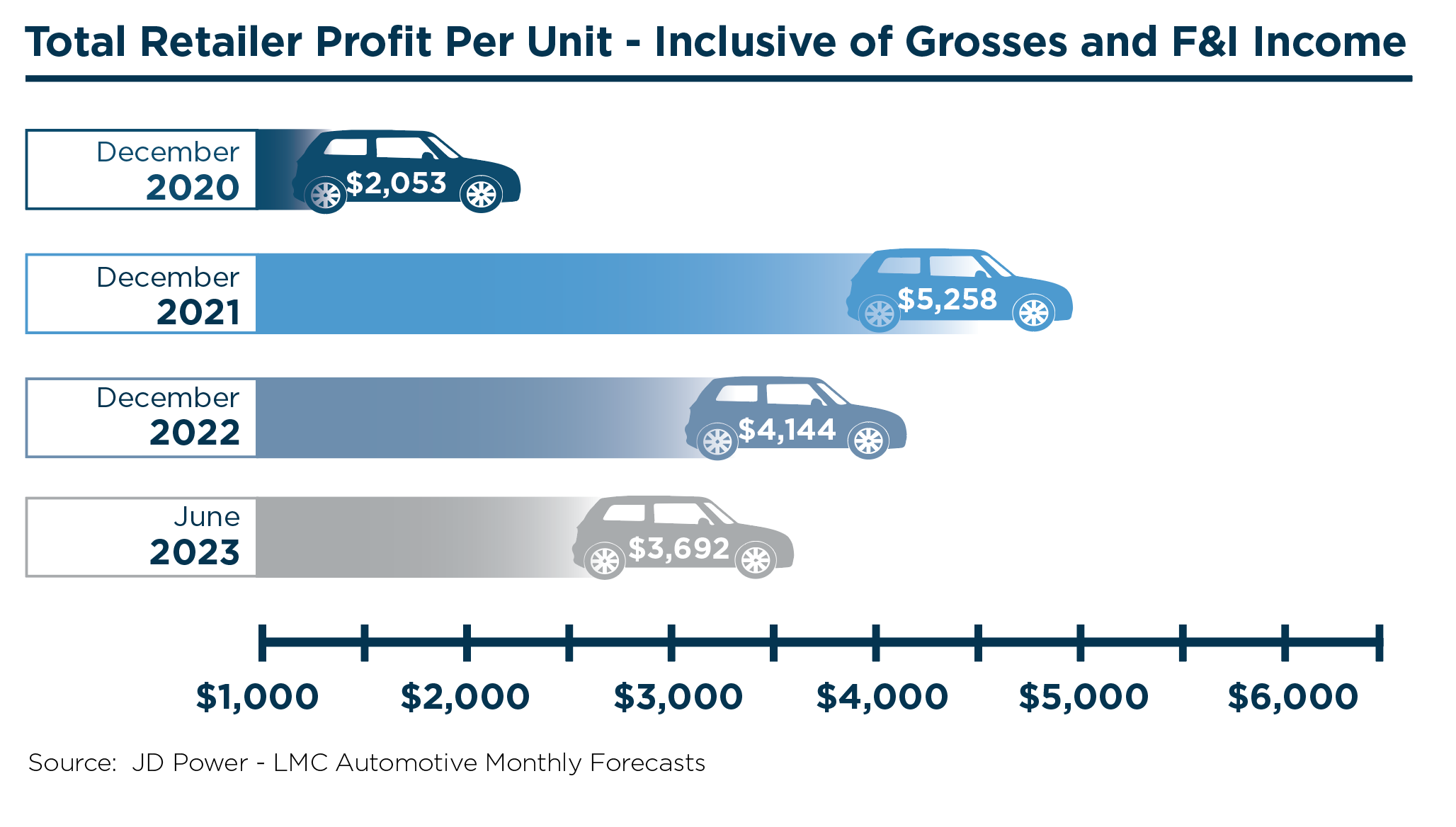 Total retailer profit per unit realized by auto dealers continues to remain strong despite a trio of trends: demand may be tempered due to high transaction prices and high interest rates, incentives offered by manufacturers have increased over the first half of the year, and vehicle supply continues to improve. But has this metric peaked? The chart below, created with elements provided by the JD Power and LMC Automotive forecast, illustrates the current and historical estimates have declined since the year-end high-water mark of $5,258 in December 2021. While these figures have cooled in recent months, the June 2023 figure of $3,692 per new vehicle unit is more than 1.5x the margin that dealers were experiencing in December 2020 and almost three times the margin realized in December 2019.