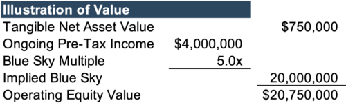 To determine a control premium, we first have to develop the “base” value to which we add the premium. As an example, let’s consider a dealership whose ongoing pre-tax income is anticipated to be $4 million. Let’s further assume that 5.0x is a reasonable Blue Sky multiple for the franchise, given its historical operating performance, particularly as it relates to its regional peers. Adding the implied Blue Sky Value to $750,000 in tangible net assets, the equity value of the dealership would be $20.75 million.
