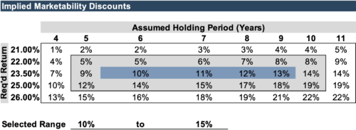 Our DLOM analysis typically considers the Quantitative Marketability Discount Method (“QMDM”). Using some reasonable assumptions (see the assumptions table below) and the case outlined above, the range of marketability discounts might be 5-20%.
