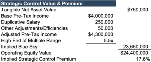 For this example, the buyer sees less risk and/or higher growth than the seller. The buyer could be overly concentrated in domestic brands, or have numerous dealerships in the same metropolitan area, so adding an import brand in an adjacent market reduces risk through diversification. The highest bidder may also just be whoever is the most bullish on the industry’s long-term prospects, particularly in light of concerns around changes to the franchise model. Let’s assume the buyer-specific factors lead them to pay a higher multiple of 5.5x or a 10% increase above the multiple a financial buyer might pay. As demonstrated below, the total strategic control premium is 17.6%.