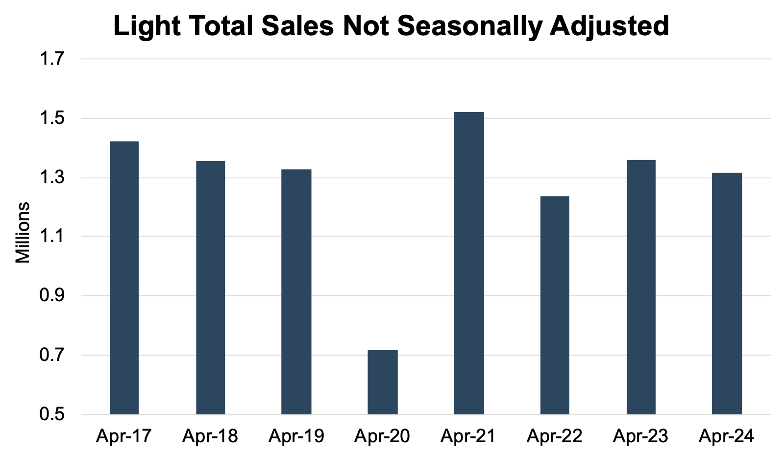 While unadjusted sales experienced a slight decline from April 2023, April 2024 sales are very similar to pre-pandemic levels, which is becoming a theme across many of the data points we track. The chart below shows unadjusted total sales volumes for the last eight Aprils: