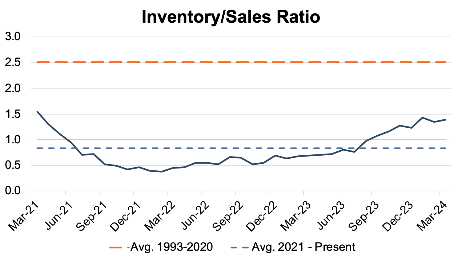 In March 2024, the inventory-to-sales ratio rose slightly to 1.39x from 1.35x in February 2024. Additionally, the last seven months have been above the 1.0x threshold, indicating that the industry has generally recovered from the lows of the pandemic. The chart below illustrates the industry’s inventory-to-sales ratio over the last three years.