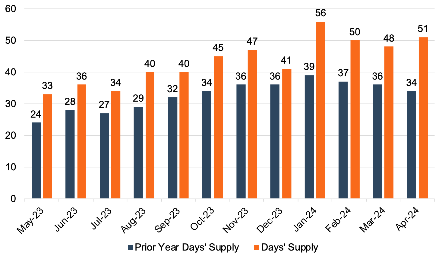 Days' Supply, another indication of the relationship between auto sales and inventory, has remained generally elevated over the last year. April 2024 Days' Supply expanded to 51, and we believe it is likely that Days' Supply will stick around 50 over the next few months. The chart below presents Days' Supply for U.S. Light Vehicles over the past twelve months (per Wards Intelligence):