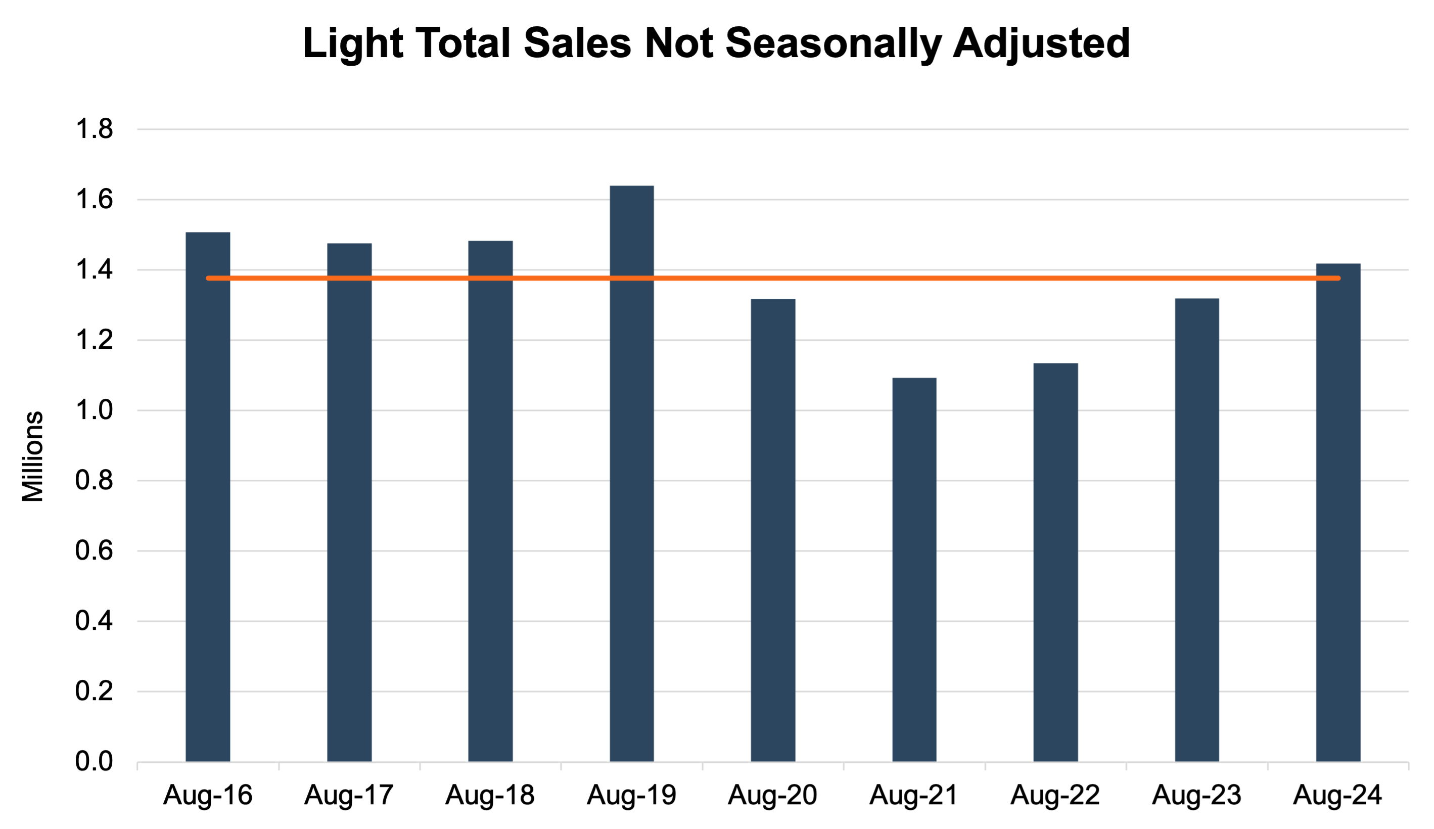 Comparing the August 2024 SAAR to the same month last year, the metric is down 1.1%. However, unadjusted sales outpaced August 2023 due to a unique calendar quirk, with Friday and Saturday of Labor Day weekend falling in August, giving August 2024 a coveted extra selling day. Year-over-year changes in the SAAR have been very modest throughout all of 2024. Despite the modest decrement this month, the general trend has been that 2024 unit sales have outpaced 2023 unit sales. For example, cumulative unadjusted sales over the first eight months of the year are 2.2% higher than the first eight months of 2023.