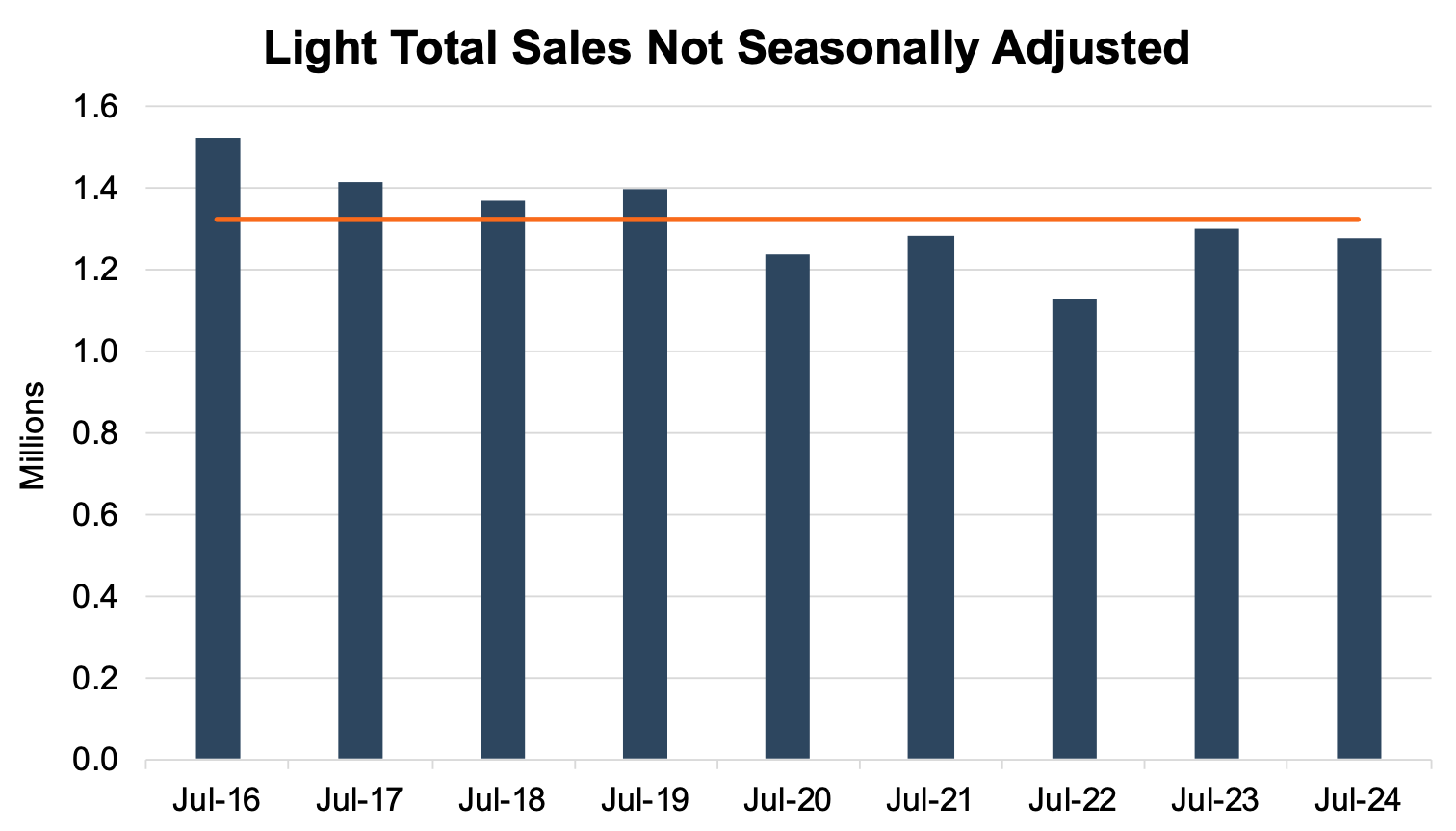 On an unadjusted basis, the industry sold 1.27 million total units in July 2024, a 3.0% decrease from last month. July 2024 sales fell below the nine-year July average, which captures the pandemic year as well as the four years before and after. The chart below shows unadjusted total sales volumes for the last nine Julys and the nine-year average in orange, which shows the stark difference in volumes pre- and post-COVID as all four Julys prior to the pandemic exceeded each year of post-pandemic sales.