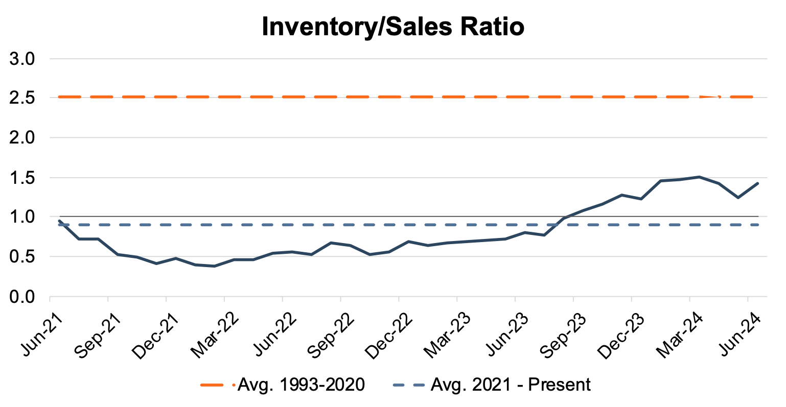 An inventory-to-sales ratio greater than 1.0x indicates that the seasonally adjusted inventory level at the end of the month was greater than reported sales; this data tends to lag by a month or two. In June 2024, the inventory-to-sales ratio jumped to 1.42x from 1.25x in May 2024. As we expected, the spike in this metric reflects the impact the CDK cyberattack had on the industry during late June. Looking at the longer-term trends in the metric, it is clear that inventories across most brands have been recovered for some time now as dealers are saddled with more inventory than they are selling in any given month. Some public auto dealers have complained about an elevated days’ supply in their most recent Q2 earnings calls, as dealers typically have little control over how many units they are allocated. Stay tuned for a more detailed analysis of these earnings calls in our next blog. The chart below illustrates the industry’s inventory-to-sales ratio over the last three years.