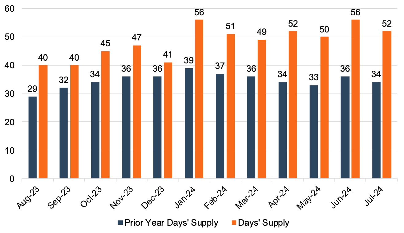 Following fairly elevated inventory levels in June, days’ supply (another indication of the relationship between auto sales and inventory) came in at 52 days in July 2024. While this is certainly higher than the same time last year and reflects a recovery in the manufacturing supply chain at a global level, this measure of average inventory availability obscures the large differences in days’ supply by brand. For example, Toyota has been reported to have a days’ supply below 20 days while Stellantis has been reported at nearly 100 days or more. The chart below presents days’ supply for U.S. Light Vehicles over the past twelve months (per Wards Intelligence).