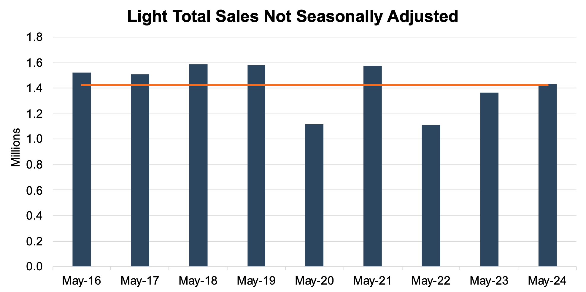 On an unadjusted basis, the industry sold 1.43 million total units in May 2024, an 8.3% decrease from last month. While unadjusted sales are still catching up with pre-pandemic levels, May 2024 sales are approaching the nine-year average (encapsulates the pandemic year as well as the four years before and after). The chart below shows unadjusted total sales volumes for the last nine Mays and the nine-year average in orange:
