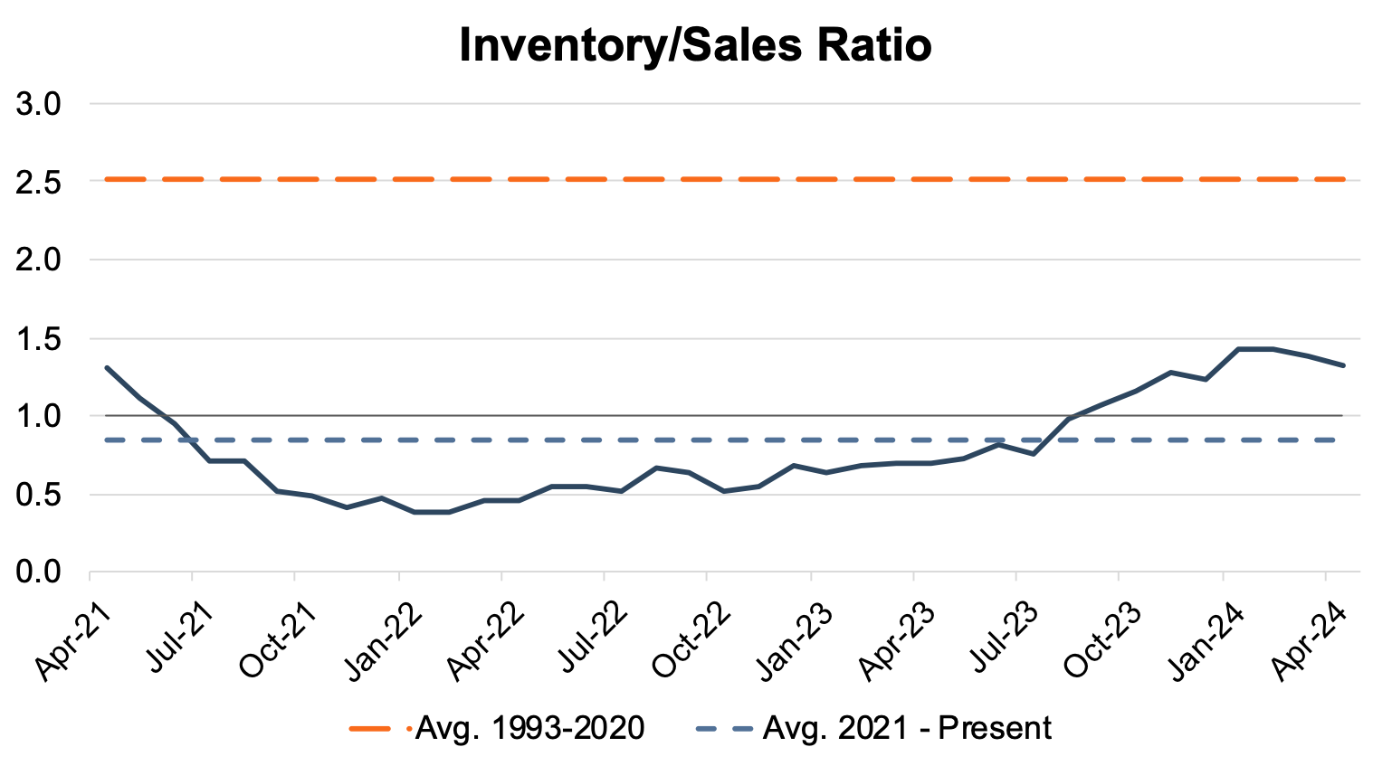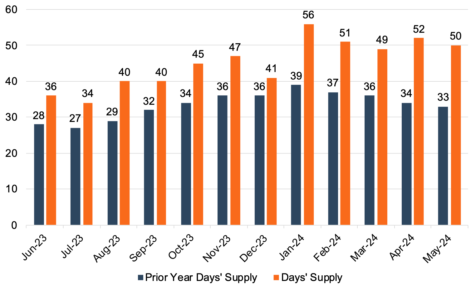 An inventory-to-sales ratio greater than 1.0x indicates that the seasonally adjusted inventory level at the end of the month was greater than reported sales; this data tends to lag by a month or two. In April 2024, the inventory-to-sales ratio dipped slightly to 1.33x from 1.39x in March 2024. April 2024 marks the eighth consecutive month above the 1.0x threshold, suggesting the industry inventory has largely recovered from the lower levels seen throughout the pandemic. The chart below illustrates the industry’s inventory-to-sales ratio over the last three years. Days’ Supply, an indication of the relationship between auto sales and inventory, has continued to exceed last year’s levels. May 2024 Days’ Supply came in at 50, and we believe it is likely that Days’ Supply will hover around 50 for the next few months. The chart below presents Days’ Supply for U.S. Light Vehicles over the past twelve months (per Wards Intelligence):