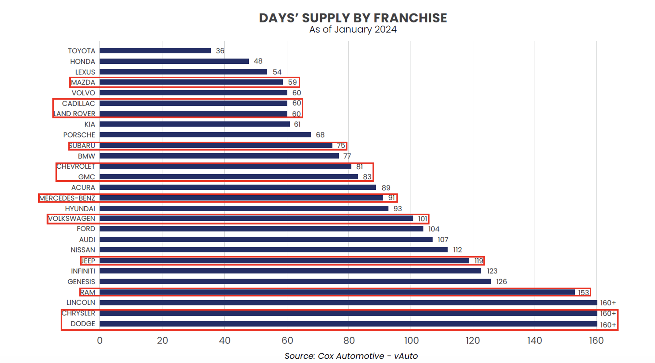 If there are delivery delays, we could see Days’ Supply increase for Mazda, which is towards the low end of all brands. Stellantis’ brands also have the highest Days’ Supply, so any disruption may not negatively impact dealers who are seeing increasing holding costs. Still, it would depend on which brands and models are the most directly impacted, as we learned from the UAW strike.
