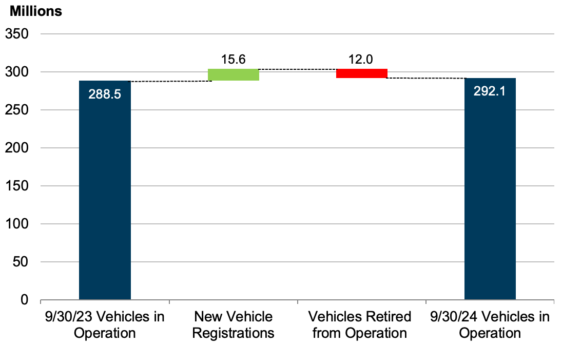 In the U.S. and Canada, light duty vehicles in operation were 292.1 million on September 30, 2024, a positive difference of 3.6 million units or 1.2% higher than the same figure in Q3 2023. In fact, light-duty VIO has increased by 3.6 million units for two years in a row. These two consecutive, identical increases may have happened by chance but certainly highlight a longer-term trend of expansion in the car parc due to increased manufacturing activity post-COVID and fewer retirements due to longer-lasting vehicles. A segment of consumers being financially stretched also contributes to an increasing age of VIO. The specific components of light vehicle VIO change over the last twelve months are 15.6 million new vehicle registrations minus 12.0 million vehicles taken out of operation. See the chart below for a visualization of the change in VIO over the last year.