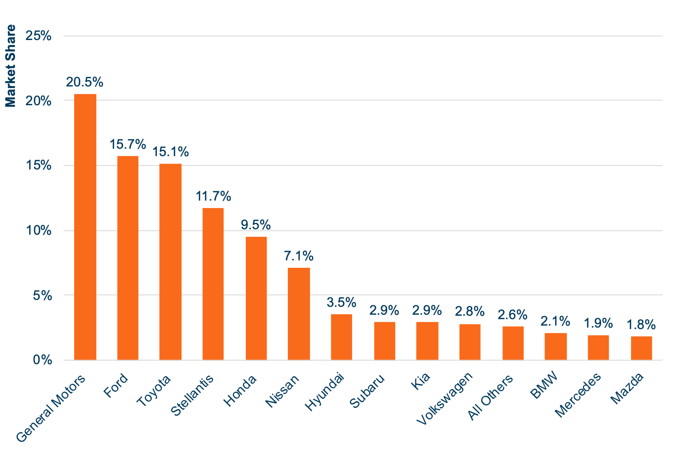 General Motors, Ford, and Toyota are the most popular manufacturers in this cross-sectional data snapshot. VIO by manufacturer data represents what vehicles are currently on the road and includes vehicles of all ages, not just new vehicles. This data does not reflect consumer satisfaction or current sales trends but typically lags because it is more long-term focused. Therefore, this data is best viewed as a rearview mirror rather than a windshield for the industry, though it gives an eye into parts and service departments today. Going forward, we expect these proportions to slowly shift towards prevailing sales trends. GM and Ford continue to lead the way, representing 20.5% and 15.7% of total VIO, respectively. However, these two domestic manufacturers have slowly lost market share to import brands in recent years. The best example is Toyota, which has gained over the last couple of years but still lags behind Ford and GM. Perhaps we may see Toyota jump Ford and approach GM in total VIO soon. Kia is another notable mover on this list over the last year, as it gained two percentage points and jumped one spot from tenth to ninth. In some ways, this data reflects what we've seen with auto dealership values. For example, Toyota has outperformed, as seen in the graph above, which has translated to higher dealership values as reflected in Blue Sky multiples.