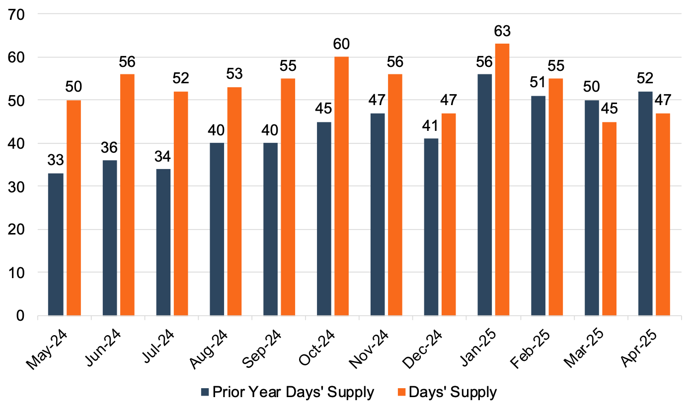 In April 2025, industry-wide days’ supply came in at 47 days. While the margin between the current and prior month comparisons continues to narrow, April 2025 is the second consecutive year-over-year decline in days’ supply after numerous months of improvements. With uncertainty surrounding the tariffs and their potential impacts on the auto industry, we will likely see days’ supply continue to trend lower over the next several months until stability from the tariff implementations is reached. The chart below presents days’ supply for U.S. light vehicles over the past 24 months (per Wards Intelligence).