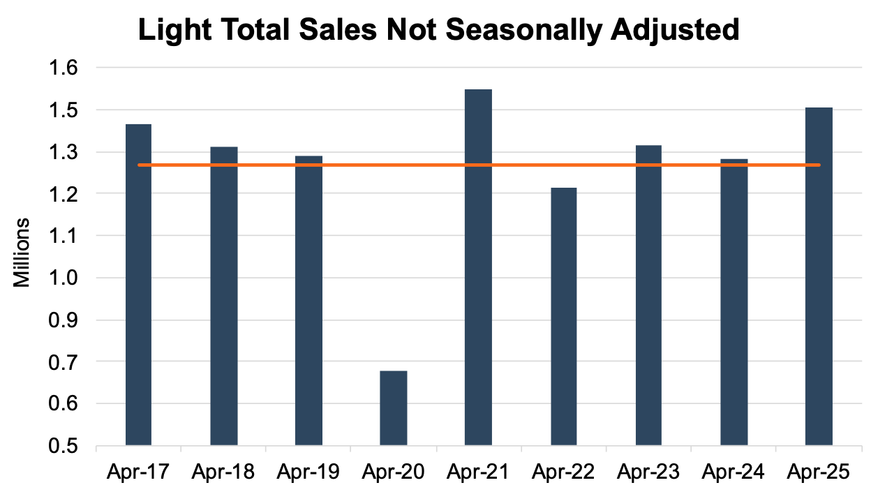 Unadjusted sales were also markedly higher than this time last year. With just one more selling day than April 2024, April 2025 industry sales (on an unadjusted basis) reached 1.46 million units, an 8% decrease from last month and an 11.1% increase from April 2024. This month’s unadjusted sales surpassed the nine-year April average of 1.3 million units (2017 – 2025) by over 162 thousand. See the chart below for a look at unadjusted sales over the last nine Aprils.