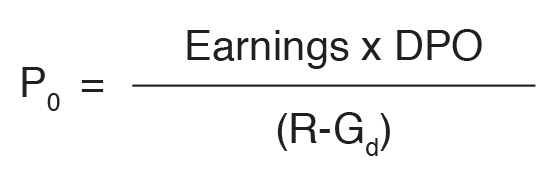 D1 is equal to Earnings times the portion of earnings paid out, or the dividend payout ratio (DPO), so we can rewrite the basic equation as follows: