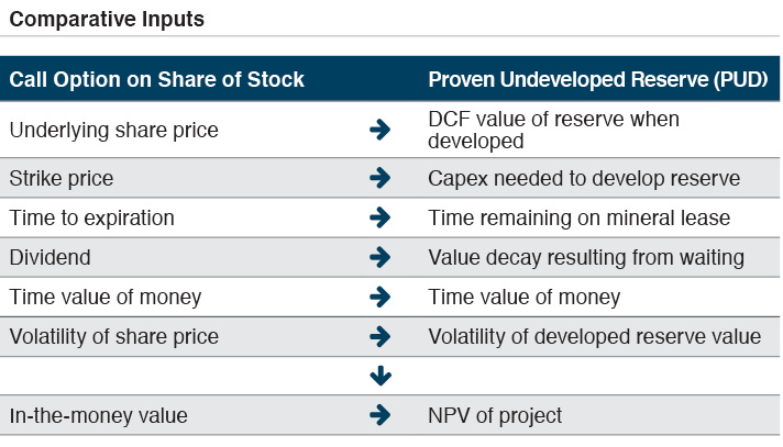 The PUD and unproved valuation model is typically seen as an adaptation of the Black Scholes option model. It is most accurate and useful when the owners of the PUDs have the opportunity, but not the requirement, to drill the PUD and unproven wells and the time periods are long, (i.e. five to 10 years). The value of the PUDs thus includes both a DCF value, if applicable, plus the optionality of the upside driven by potentially higher future commodity prices and other factors. The comparative inputs, viewed as a real option, are shown in table below.