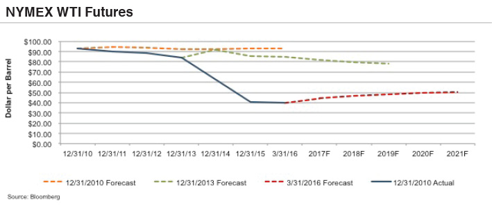 While this sounds promising, we must remember the crash in oil prices in 1985 that remained below $20 until 2003. Every analyst has a best guess of what will happen, but there are simply too many variables involved in shifting oil prices to make accurate forecasts. Changes in any of the five drivers of low oil listed above could dramatically impact oil prices; and some of those drivers, such as the relationship between Iran and Saudi Arabia or China’s growth—contain thousands of variables that make them almost impossible to predict. In addition to all these considerations, the potential for technological changes creates another unpredictable component. A common solution in DCF models is to use the NYMEX WTI futures to project price. However, studies show that, even though buyers are estimating the value of this option into the prices they are willing to pay, this too is not a very accurate predictor of the future. When NYMEX forecasts $35 per barrel it could actually be $45 when that future date rolls around. NYMEX-WTI-Futures Experienced dealmakers realize that the NYMEX future projections amount to informed speculation by analysts and economists which that many times vary widely from actual results. Note in the chart above how much the future forecasted prices changed in only one year. So what actions do acquirers take when values are out of the money in terms of drilling economic wells? Why do acquirers still pay for the non-producing and seemingly unprofitable acreage? In many cases they are following an options framework.