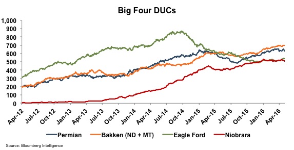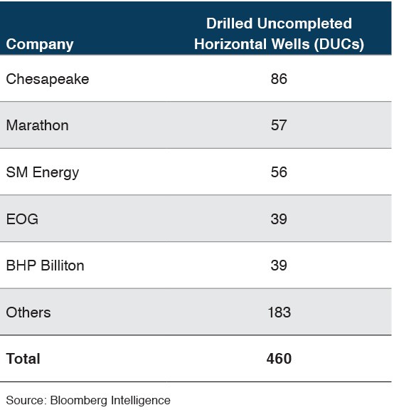 chart_big-four-ducs Many of the big shale producers are jumping on board the fracklog bandwagon. The largest U.S. shale producer to fracklog is EOG Resources (EOG). It started 2015 with 200 DUCs and announced it would “intentionally delay” about 85 more wells this year (these are overall figures, not Eagle Ford specific). Anadarko Petroleum (APC) said it expects to have about 440 uncompleted wells by the year’s end. As a point of comparison, last week there were only a total of 44 rigs in the Eagle Ford, as compared to 205 at year-end 2014. As it pertains to the Eagle Ford specifically, Chesapeake leads the way with 86 DUCs with several other major Eagle Ford players with significant counts as well. Producers have hoped this would bring value to their shareholders, by delaying capital expenditures and functioning as storage for future reserves. These companies can then wait for more favorable oil and gas prices that justify the capital investment to complete the wells. This brings a favorable ROI to the costs, which is the core metric that management teams are tracking. How much value that this creates (or preserves depending on point of view) is linked to how much capital it requires to complete the well as compared to production and price (production x price = revenue). The Eagle Ford shale has pockets of some of the best possible wells for this ROI potential. Bloomberg Intelligence has estimated that breakeven prices for oil in the Eagle Ford can be as low as $27 per barrel. This helps explain why DUCs in the Eagle ford actually decreased in 2015 while other plays had a marked increase; several groups of wells in the Eagle Ford still had positive ROI’s and were economical to be drilled. However, there is a flip side to simply waiting until oil prices go up. Some estimates claim it will take only one to three months to get production from these now-uncompleted wells.  Bloomberg Intelligence has projected the output from these wells to be as high as three million barrels per day. This onslaught of new oil could serve to cap any rally in the oil prices.