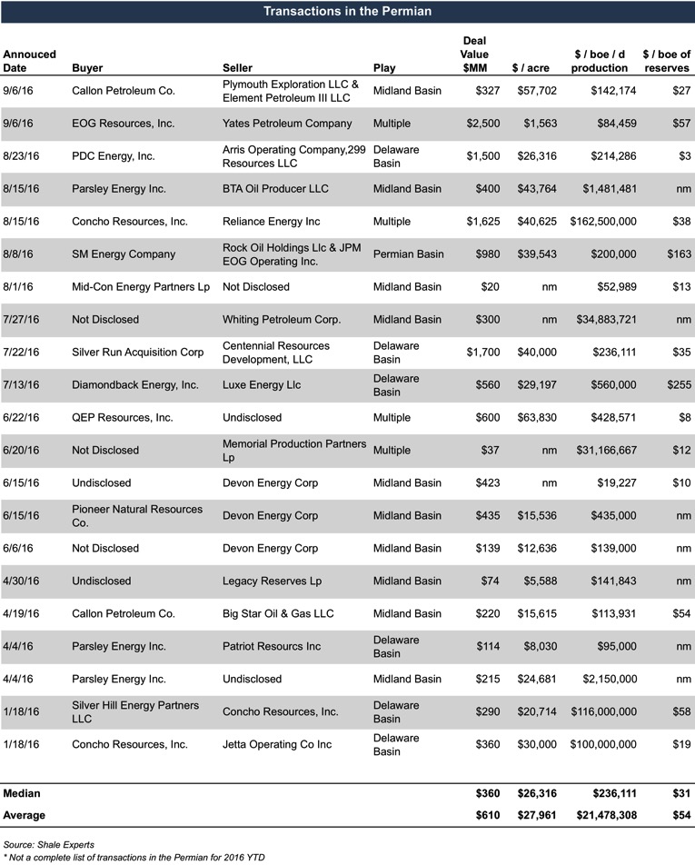 This uncertainty about the future price of crude oil has caused producers to leave other plays and increase their acreage in the Permian. Consequently, this has increased acreage prices in the Permian compared to other plays, such as the Bakken and Eagle Ford. A summary of some transactions in the Permian this year is shown below.