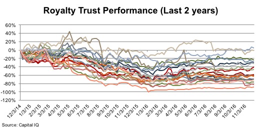 In August 2016, we discussed bankruptcy and valuation issues related to royalty interest owners. We mentioned using the publicly traded market as one method to value royalty interests, specifically observing royalty trusts. As a primer for O&G royalty trusts, these trusts hold various royalty and net profit interests in wells operated by large exploration & production companies. These trusts have little in the way of operating expenses, have defined termination dates and can serve as an investment opportunity that provides exposure to oil and gas prices. This Motley Fool article, from 2014, explains the pros and cons of investing in this sort of vehicle.
