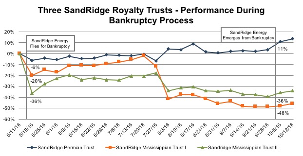 Uncertainty is high as some operators have been forced to file bankruptcy after commodity prices have remained low for too long for them to survive. Three of the above 20 royalty trusts are tied to SandRidge Energy. In May 2016, SandRidge Filed for Bankruptcy Reorganization and Emerged from Bankruptcy in October 2016. During this time, the three royalty trusts: (1) SandRidge Mississippian Trust 12, (2) SandRidge Mississippian Trust II3 and (3) SandRidge Permian Trust4 experienced the following performance: