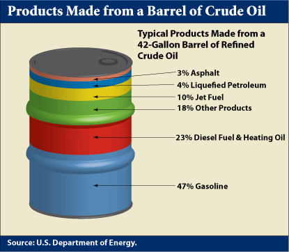 Asphalt and road oil are used primarily by the construction industry for roofing and waterproofing and for road construction. Asphalt is a byproduct of petroleum refining. During the distillation process of crude oil, asphalt does not boil off and is left as a heavy residue. Generally around 90% of crude is turned into high margin products such as gasoline, diesel, jet fuel, and petrochemicals while the other 10% is converted into asphalt and other low margin products. Petroleum refiners sell asphalt to asphalt product manufacturers who produce retail products such as asphalt paving mixtures and blocks; asphalt emulsions; prepared asphalt and tar roofing and siding products; and roofing asphalts and pitches, coating, and cement.