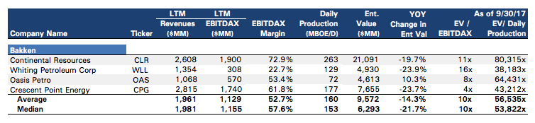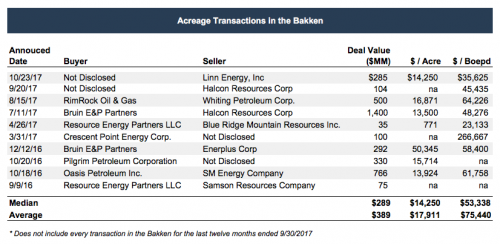 Transaction activity in the Bakken shale was both busy and revealing in the second half of 2017. Many of these deals marked the departure of a number of companies that were known to be active in the play, particularly Halcon Resources. Other companies, however, have remained. The table below, drawn from Mercer Capital’s 3Q17 Bakken-focused newsletter, shows some details in regards to recent transactions, including some comparative valuation metrics.