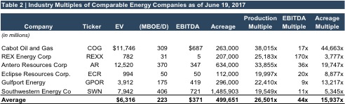 In comparison to other operators in the Marcellus and Utica, the transaction is on the higher end of the range with Antero Resources Corp (AR) and Cabot Oil and Gas (COG) when considering an EV/Daily Production multiple and on the high end with the acreage multiple (See Table 2). However, the “reported” value multiples may not be the whole picture.
