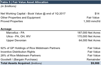 Considering the purchase price implications of the Rice Energy transaction, based upon the publicly disclosed information, the assets to allocate to fair value appear as found in Table 5.