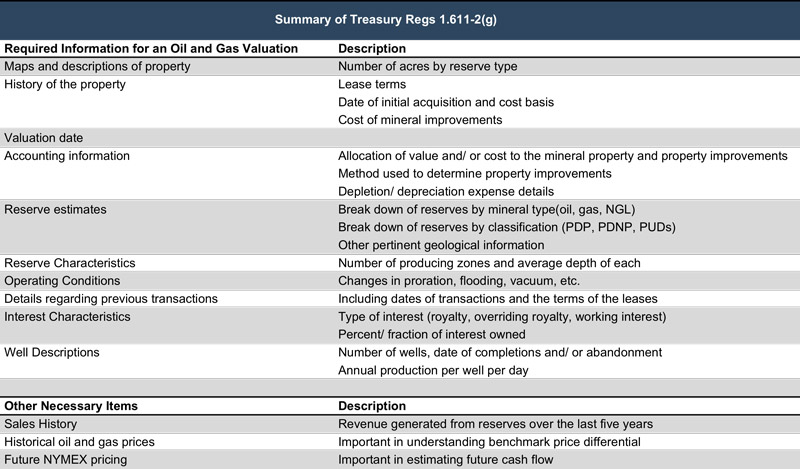 Treasury Regulation Section 1.611-1(d)(2) provides guidance in determining the fair market value of oil and gas properties. It similarly provides that “the fair market value of an [oil and gas] property is the amount which would induce a willing seller to sell and a willing buyer to purchase.” Additionally, Section 1.611-2(g) outlines some considerations that a valuation of mineral properties must include for tax-oriented appraisals. A summary of these considerations is shown in the chart below.