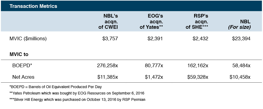 • Based upon net acres acquired, the CWEI transaction was priced in the middle of Yates and SHE and slightly above its’ suitor NBL.