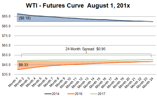 To break down the significant change over the previous three years, the chart below shows the 2014, 2016, and 2017 WTI futures curve for 24 months and the spread between Month 1 and Month 24. Positive spread indicates backwardation, while negative spread indicates contango.