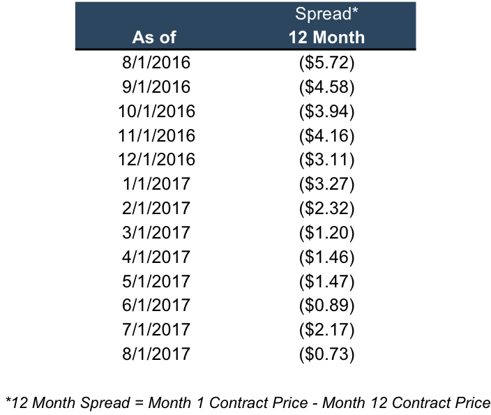 It currently appears that pricing in the future contracts are moving closer to backwardation. The table below shows the future contract spread for the previous 13 months. The most recent data returns the narrowest spread since 2014 of ($0.73) compared to one year ago when the market had a wider contango spread of ($5.72).