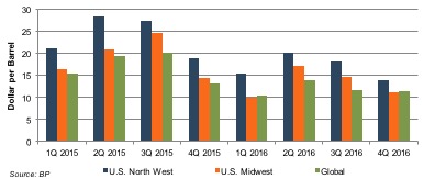 Refiners’ margins increased dramatically in the second and third quarters of 2015 as the price of crude fell and the price of refined petroleum products lagged behind. Refiners in the U.S. North West were making between $27 and $28 per barrel of oil, while global margins barely reached $20 per barrel. However, in the fourth quarter of 2015 refined product prices fell, refiners’ margins tightened, and the geographic gap in margins narrowed. After some relief in margin pressure in the second quarter of 2016, margins tightened to the lowest seen in three years.