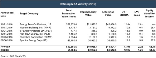 M&A activity in the refining sector was sluggish in the first half of 2016, partially due to the uncertainty which surrounded the refining industry and future regulation. However, M&A activity picked up in the third and fourth quarter of 2016. The chart below shows key valuation metrics associated with refining transactions which were announced in 2016.