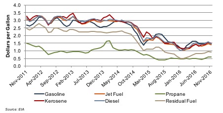 Although the price of crude oil remains low in comparison to historical levels, refined product prices fell to a similar extent as crude prices. As shown below, the price of gasoline fell to a low of $1.05/gallon in February 2016, which was almost one-third of the price of gasoline in July 2014. Since February the price of gasoline has increased 36%. In general, refined product prices have fallen over the last two years but have seen some recovery over the last 10 months.