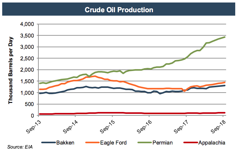 According to Baker Hughes, rig counts in North America declined 1.0% in the last three months, but increased 11.4% over the last twelve months. The Permian Basin has led the way with an increase of 26.2% in the past year, leading them to have 46.5% of total rigs. Rig counts peaked in the Bakken in May 2018, reaching heights unseen since 2015, but the Bakken continues to trail the Eagle Ford, Permian, and Appalachia regions. While rig counts aren’t ballooning in Bakken, this may be because operators like Continental are focusing on completing wells that have already been drilled (“DUCs”), a cheaper alternative to drilling new ones.