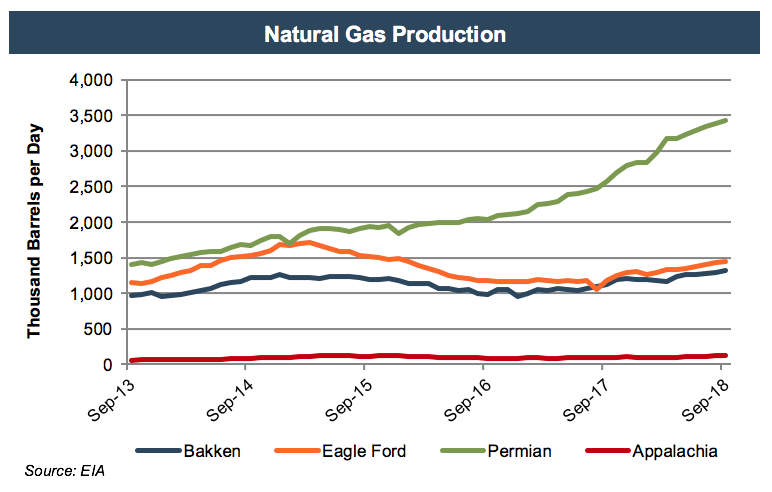 Although oil production in the Bakken has increased 9.9% in the past year, it lagged the other four regions covered with the Permian setting the pace with a 26.6% increase. Natural gas production in the Bakken increased 17.2% in that same time, again trailing the Permian’s growth of 25.5%. Given the Bakken only produces a little over a third as much crude oil and a fifth of the natural gas, it will be interesting to see if the Permian can maintain its torrid pace or if capacity constraints will allow others to close the gap.