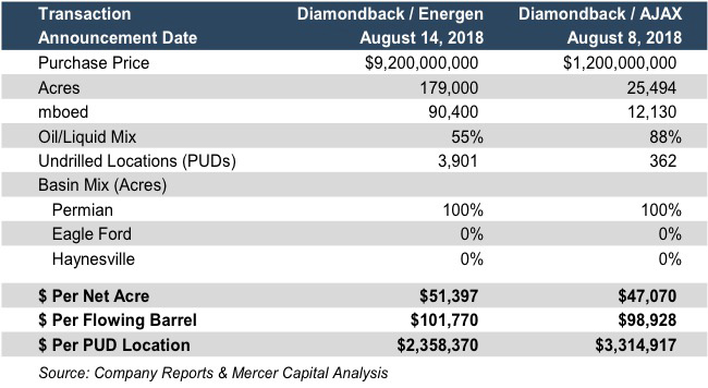 Diamondback’s larger deal was its purchase of Energen for $9.2 billion, providing 179,000 acres and about 90,400 barrels per day of current production. Diamondback also purchased AJAX Resources for $1.2 billion, gaining over 25,000 acres and about 12,130 barrels per day of production. Although smaller, this deal was more focused on acreage located in the Midland Basin.