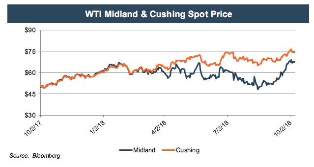 Generally, oil prices started and ended the quarter in almost the same place – around $73-$74 per barrel, but it took a circuitous route, dropping down to $65 in mid-August before climbing back. West Texas, however, has been a different story. Differentials between the standardized Cushing, Oklahoma prices and more localized Midland prices have been climbing for much of the year and remained wide until the end of the third quarter.