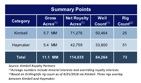 Prior to its acquisition of Haymaker Minerals & Royalties, LLC and Haymaker Resources, LP (collectively, “Haymaker”), Kimbell had nearly 5.7 million gross acres in nearly every major oil and gas basin across 20 states with a primary focus in the Permian Basin and the Mid-Continent. Kimbell solely invested in mineral and royalty interests with the largest portion of its production concentrated in the Permian Basin, where it had 1.75 million gross acres of mineral interests and ~200,000 acres of overriding royalty interests (ORRIs). Currently, KRP has 25 active drilling rigs on its acreage and mineral and ORRIs on 50,000 wells. Kimbell’s holdings in the Permian Basin alone account for 26% of its net royalty acres, 60% of its gross acreage, and 60% of active wells on its total acreage.